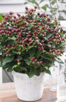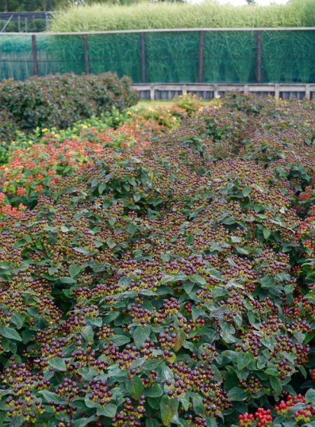 We guarantee beautifully colored berries on perfectly formed plants, whether it’s in the garden, as a lovely addition to any floral bouquet, or a brightly colored accent on your doorstep in the fall. This new line of St. John’s wort gives you break-through, saturated colors that have never been seen before. We promise these new plants will fill your fall garden with interest and your floral arrangements and containers with large, shiny long-lasting fruits! Universe has the most unique combination of berries and folage on the market. Plump, mahogany colored fruits complement the incredibly rust resistant, deep, bluish-green foliage. This is a super exciting combination never before seen in hypericum. Pair this with yellow mums and silvery-green leaved coral bells for a lovely fall combination.