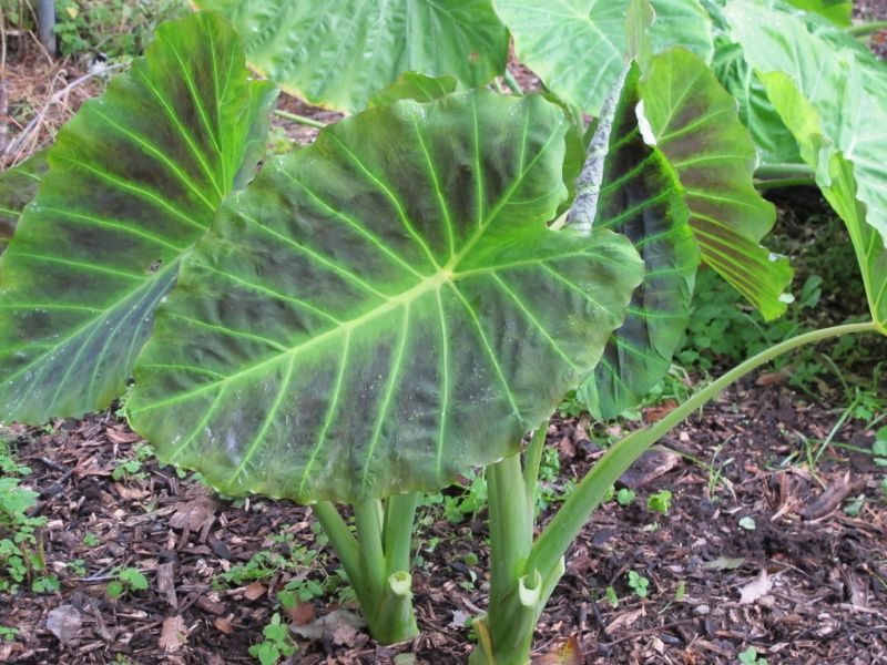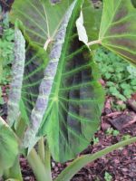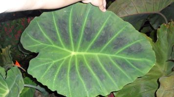 Massive black leaves are particularly ornate, accented by light green veins and stems. Robust in nature, these 3-4' long leaves are held horizontally like giant fan blades.