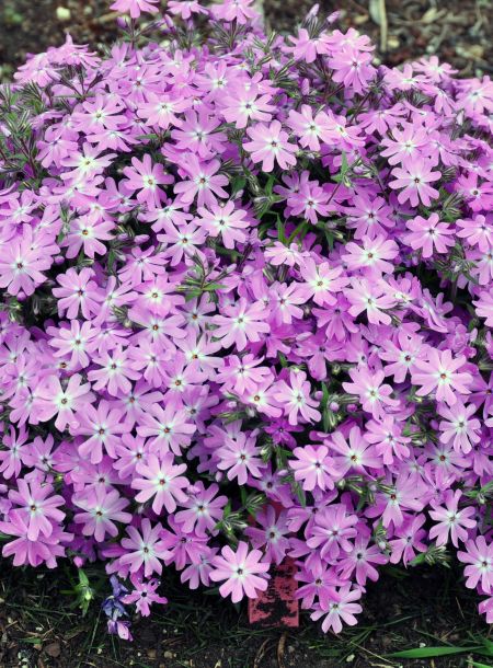 Selected primarily for its display of vibrant violet-pink flowers, this hybrid moss phlox has also proven to be exceptionally vigorous, hardy, and uniform growing. The ¾-inch-wide flowers are produced for three to four weeks. At peak bloom, the plants are 90 to 100 percent covered with flowers. Close up, you can also appreciate the flowers’ white eyes and blunt petal tips, compliments of its Phlox bifida parent. These are more mounded growers than the similar, but more spreading and layering moss phlox, Phlox subulata. Older plants may become s omewhat woody in the center. These respond favorably to light pruning immediately after flowering is completed.