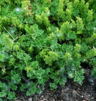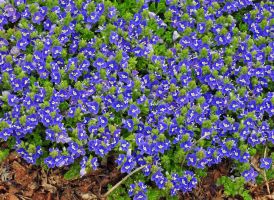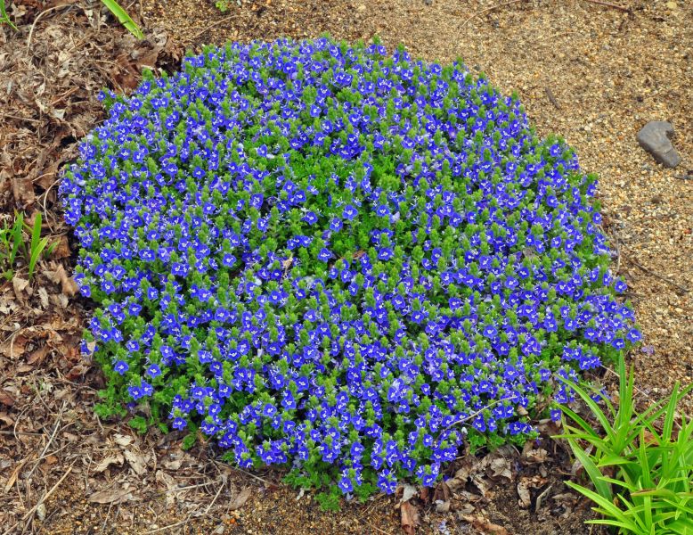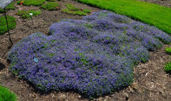 The medium to dark blue-violet flowers blanket the plant in late spring, with sporadic repeat bloom afterward well into autumn. The attractive, fine-textured foliage is evergreen, providing an excellent backdrop to its spring flowers and as a complement to bulbs and other perennials. The small oak-like leaves are medium green with a faint silvery-blue cast from its slight pubescence. This selection is in active growth much of the growing season, giving it a "fresh" appearance for much of the year. The spent inflorescences are quickly covered by new growth.