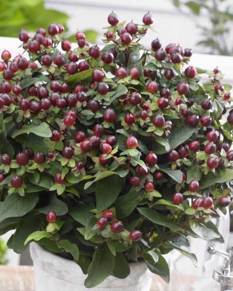We guarantee beautifully colored berries on perfectly formed plants, whether it’s in the garden, as a lovely addition to any floral bouquet, or a brightly colored accent on your doorstep in the fall. This new line of St. John’s wort gives you break-through, saturated colors that have never been seen before. We promise these new plants will fill your fall garden with interest and your floral arrangements and containers with large, shiny long-lasting fruits! Universe has the most unique combination of berries and folage on the market. Plump, mahogany colored fruits complement the incredibly rust resistant, deep, bluish-green foliage. This is a super exciting combination never before seen in hypericum. Pair this with yellow mums and silvery-green leaved coral bells for a lovely fall combination.