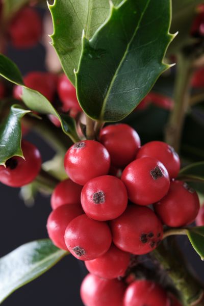 Upright, blue holly with super shiny leaves and an abundance of red fruits.