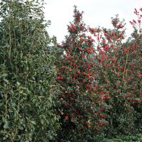 Pyramidal shaped, upright, blue holly with super shiny leaves and an abundance of red fruits all winter.