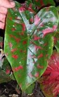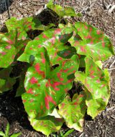 Vibrant, but certainly NOT toxic, the shiny, dark-green leaves of this caladium are splotched with red and reflective in bright light, making them look waxed. While most caladiums benefit from shade, Poison Dart Frog is at its best in partial sun, opening new possibilities for use in the garden and mixed containers. A medium-sized grower with huge potential for decorating, combine with begonias, ferns and other shade loving plants for the perfect texture combination.