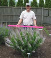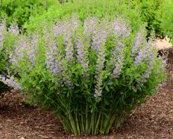 Vivid violet-lavender buds unfurl to periwinkle, lupinelike flowers with contrasting butter-cream keels. Starlite Prairieblues™ has oversized blossoms held on 24-inch-tall racemes that extend well beyond the foliage and arch grace- fully outward as they age. The flowers are positioned closely to each other, creating a very dramatic display in the garden or as a cut flower. The clean, blue-green foliage creates a fan- tastic backdrop for other flowering plants all summer long. In the late season the inflated seedpods turn charcoal-black and make valuable additions to dried flower arrangements. Starlite Prairieblues™ is a long-lived, easy-to-grow hybrid Baptisia that will produce an impressive floral display every spring. It is one of the earliest Baptisia selections to bloom at the Chicago Botanic Garden, usually showing color 7 to 10 days before B. australis and Baptisia Twilite Prairieblues™. Initially vase-shaped, Starlite Prairieblues™ becomes broad-rounded with age and has the appearance of a low, dense shrub. Its blue-green foliage remains clean and attractive all season.