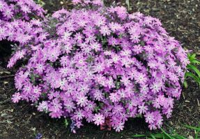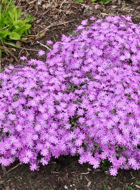Selected primarily for its display of vibrant violet-pink flowers, this hybrid moss phlox has also proven to be exceptionally vigorous, hardy, and uniform growing. The ¾-inch-wide flowers are produced for three to four weeks. At peak bloom, the plants are 90 to 100 percent covered with flowers. Close up, you can also appreciate the flowers’ white eyes and blunt petal tips, compliments of its Phlox bifida parent. These are more mounded growers than the similar, but more spreading and layering moss phlox, Phlox subulata. Older plants may become s omewhat woody in the center. These respond favorably to light pruning immediately after flowering is completed.