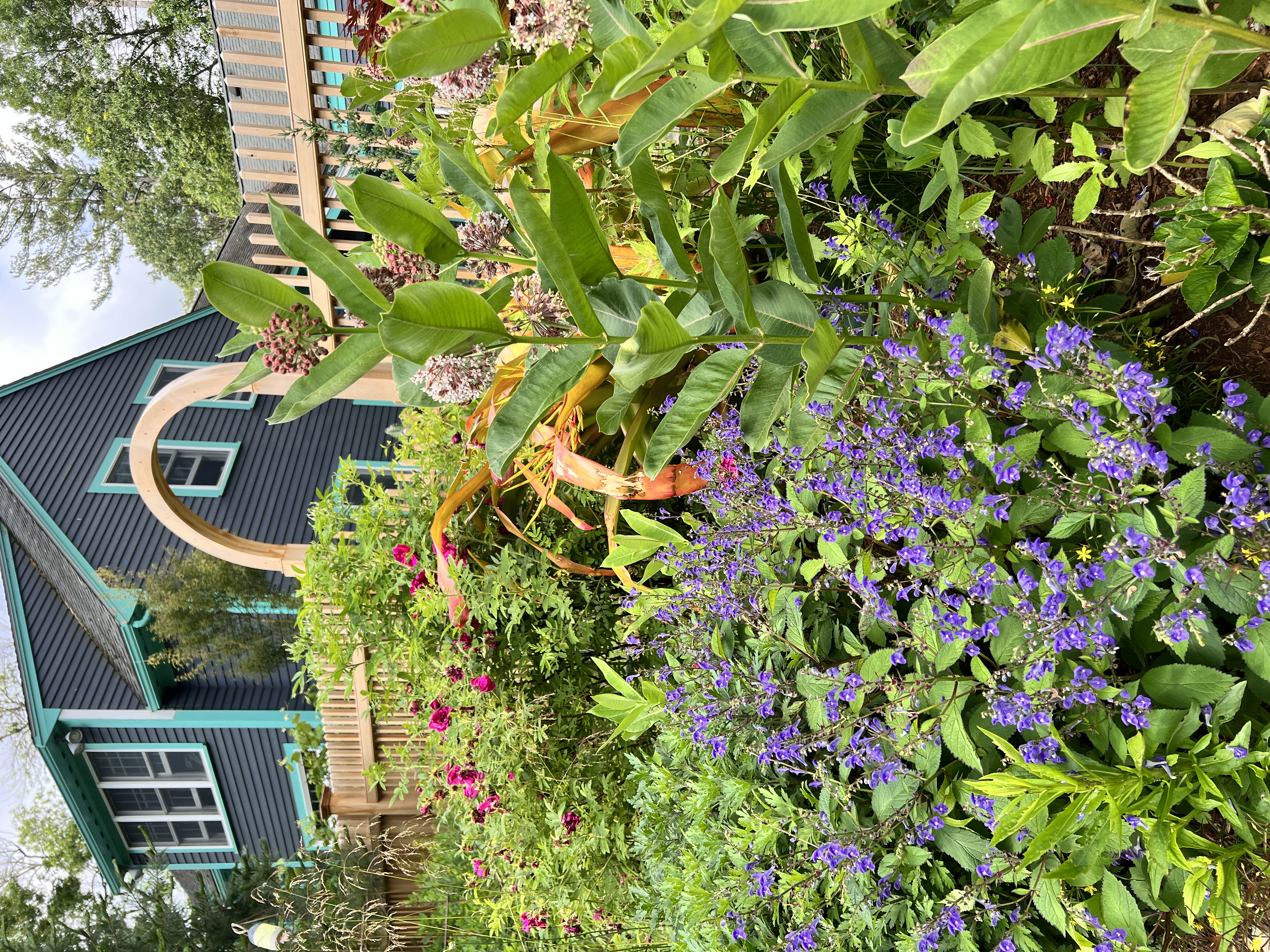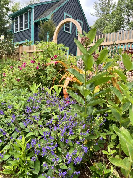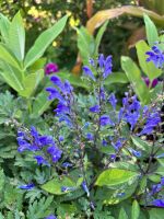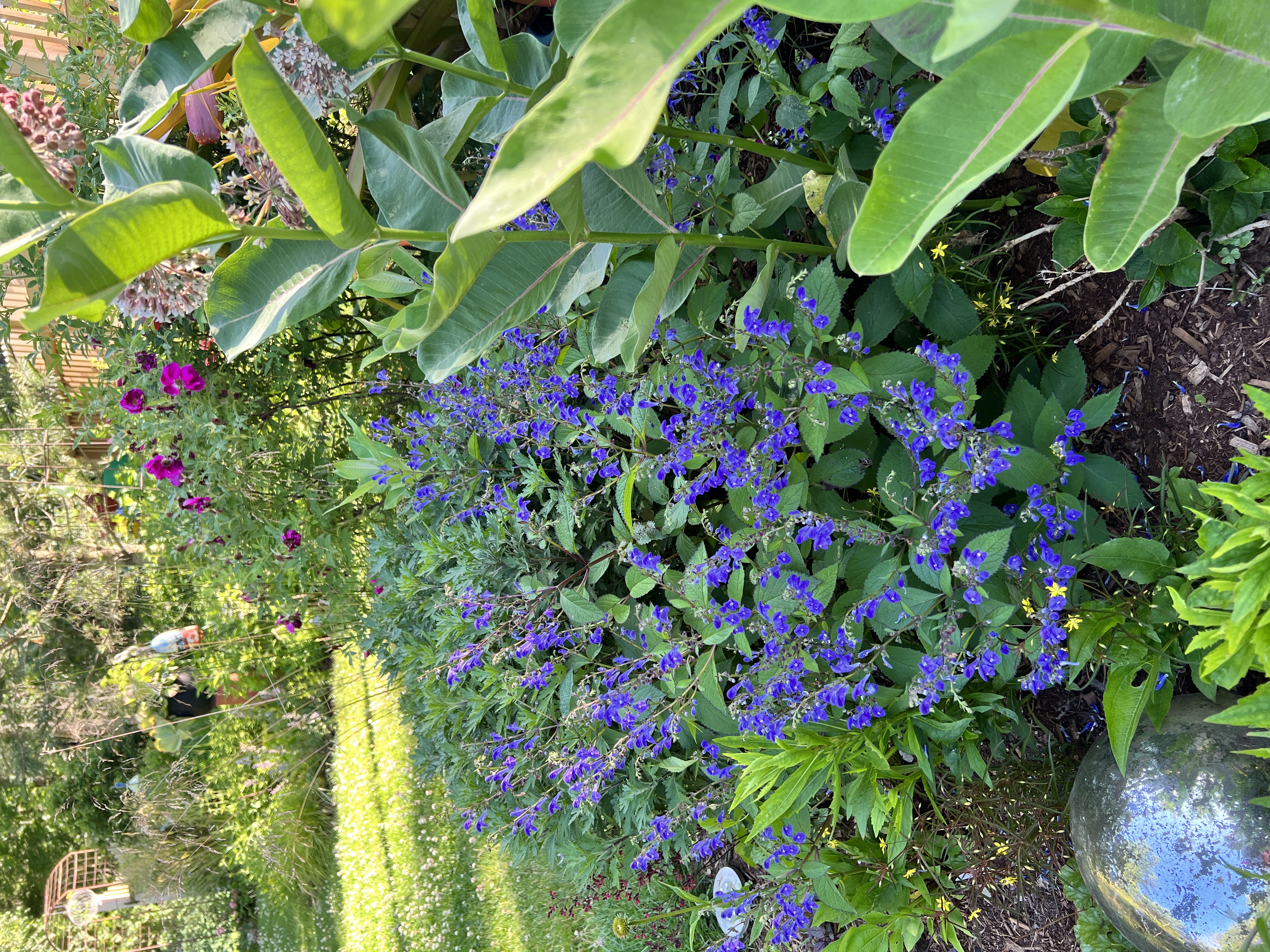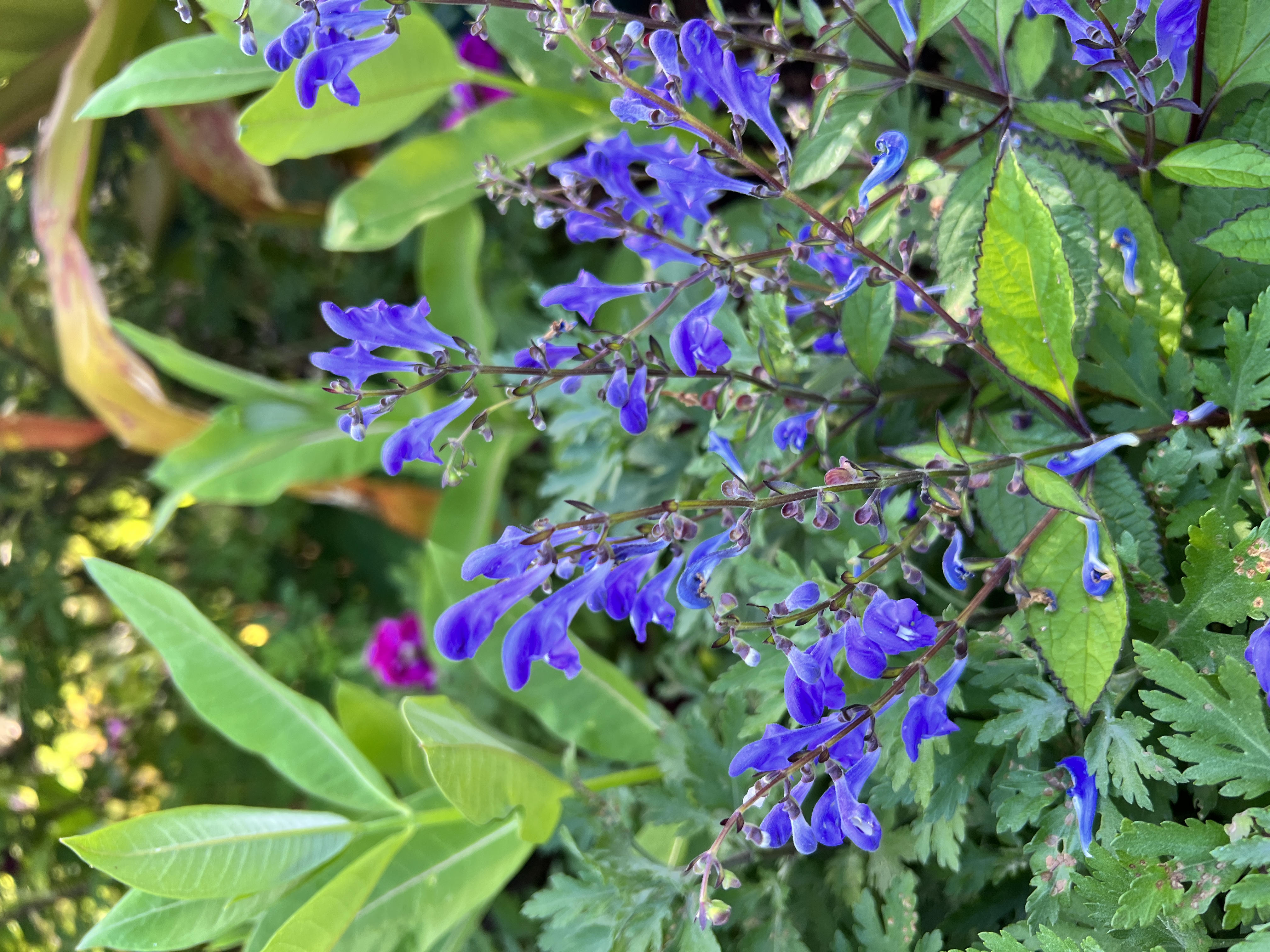 Bumblebee Blues had large clusters of hooded, salvia-like flowers with white throats. It's like a tropical salvia, but hardy to zone 4! this plant will take full sun and part shade, flowering equally in both.