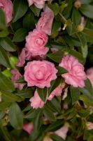 A perplexing color to identify, the tissue-like flowers of this intriguing new sasanqua bloom in various shades of pink with a hint of coral, and are plentiful at a young age. A semi-dwarf plant with spreading to rounded growth, the dark green foliage provides a perfect backdrop for an incredible display of blooms in the fall.