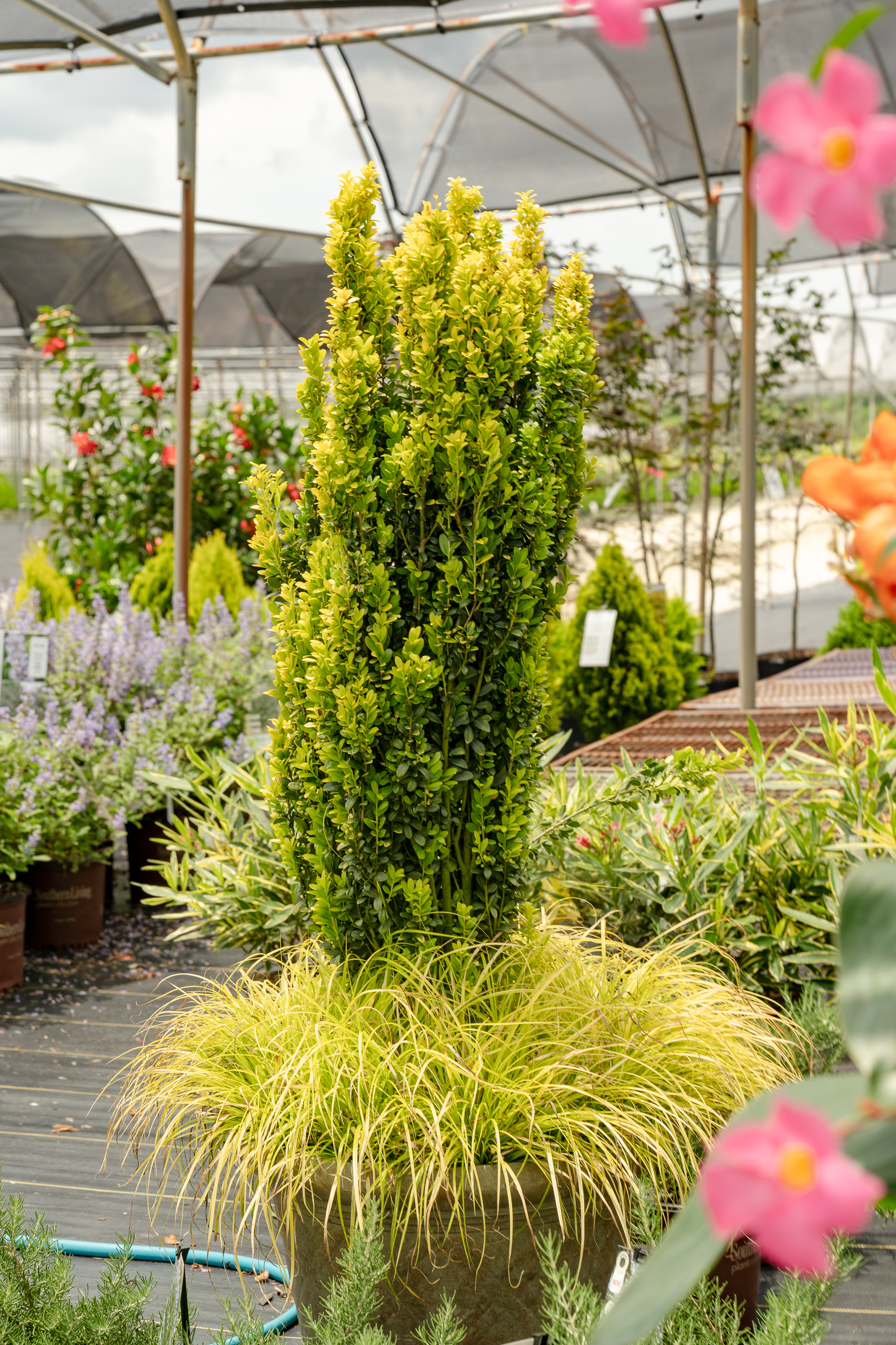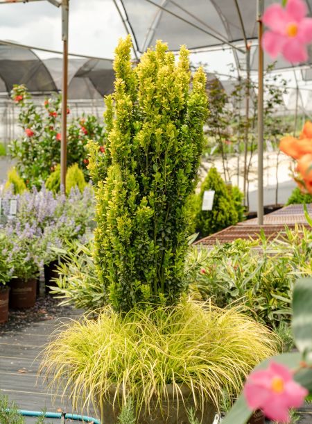 Most of us are familiar with Sky Pencil holly…the versatile, tall, narrow, pencil-thin form that's used in landscapes throughout most of the US. Growing skyward and certain to add excitement is a new, gold leaved version, Golden Sky. Just imagine bright gold exclamation points highlighting garden entry ways, or used in special areas for accent. How about in rows for a narrow hedge or planted as the focal point in a decorative container? The uses will be endless. A distinctive look, this bright, pencil-thin evergreen will add a vertical affect to any landscape. A Southern Living®/Sunset® exclusive.