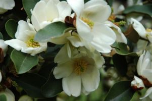 From late winter to early spring fuzzy, brown buds begin to form in the leaf axils. They open to a display of creamy-white flowers that lie across the branches evoking a sweet, alluring fragrance. The perfect size for smaller landscapes, these lovely evergreens have proven to be quite undemanding when planted in sun to partial shade as long as they have moisture retentive soils. They can be used as flowering hedges or as stand-alone specimens in place of Camellias or Ligustrum. A pH range of 5.5-7.5 is ideal and mulching is desirable.
