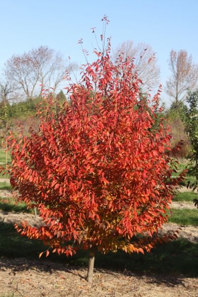 This tree is on fire! Selected by our friend Mike Yanny for its flaming, brilliant-red fall color, we think this American Hornbeam is the brightest of any in the trade. A small tree with a moderate growth rate, Fire Belle develops a rounded crown and dense branching that provides good cover for songbirds and other wildlife.