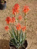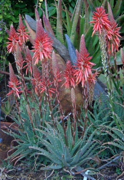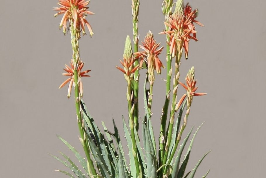 An upright, urn-shaped aloe, Spineless Hedgehog blooms with spikes of coral-red flowers in spring and again in late summer. The perfect plant for hot, dry locations.
