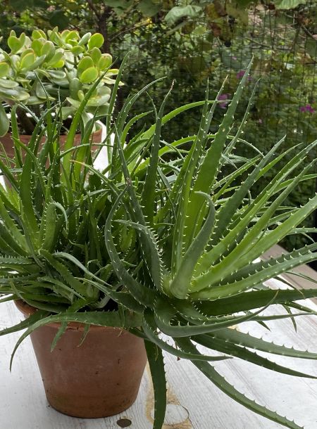 An upright, urn-shaped aloe, Spineless Hedgehog blooms with spikes of coral-red flowers in spring and again in late summer. The perfect plant for hot, dry locations.