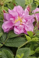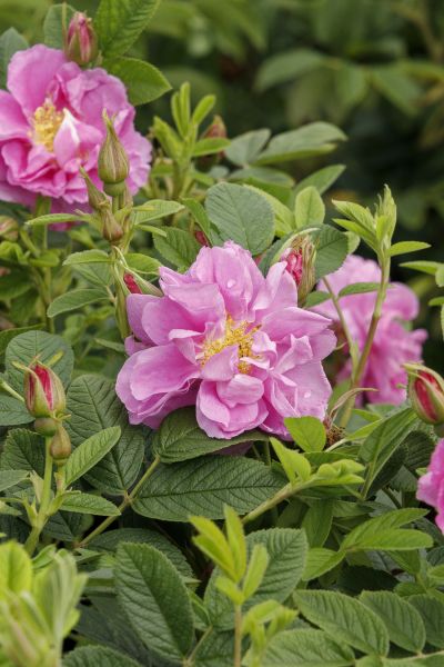 More compact than a typical rugosa, soft, crepe paper pink flowers are brightened by yellow stamens. Green, wrinkled leaves add a compelling touch with texture seldom seen in Roses. Seaside Swirl™ Pink makes a great, easy-care option for tough growing conditions. Tolerant of sea spray and road salt, its intense fragrance, and beautiful flowers are just a few of the wonderful traits that make this variety a must. In late summer, large, red-orange hips follow the flowers, just about the time leaves turn brilliant yellow.