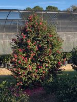 An upright, yet slender grower with deep rose pink flowers in the fall that blanket the glossy foliage in fabulous color.