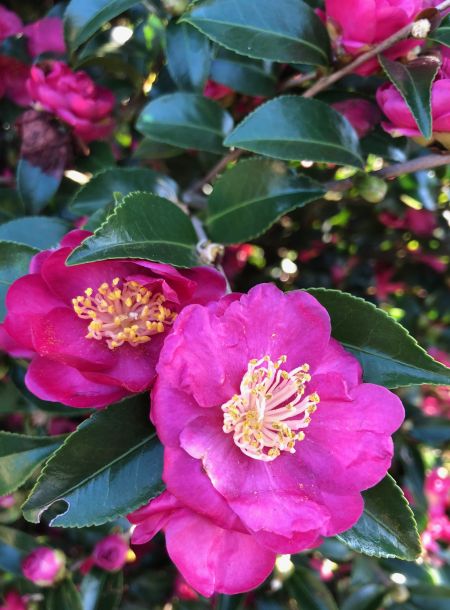 These camellias flower in fall. Should they need any pruning to shape them, be sure to do that in early spring to allow for enough time for flowers buds to form.