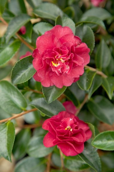 Small, Christmas red, fully double blooms decorate the deep olive green, super glossy foliage on this compact plant.