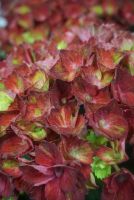 Bluish red flowers are tipped with green as they age for a marbled look. Hard, sturdy flowers on a compact, neat plant.