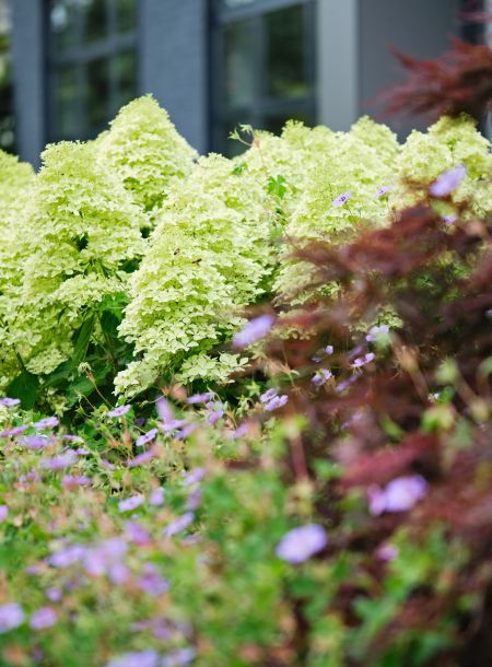 Lime Sparkle is different. It's not too short to be seen or too tall to hide stuff. The flowers begin in early June as lacy lime green panicles and open up and age throughout the summer to apple green and then celery green with a candy apple red blush once the nights get cooler.