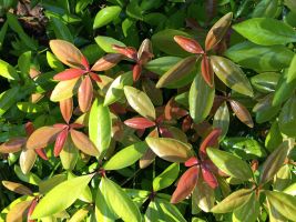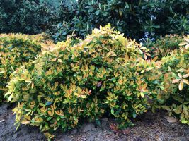 A new color in cleyera—bright yellow, with glowing hues of copper and orange on the new growth.