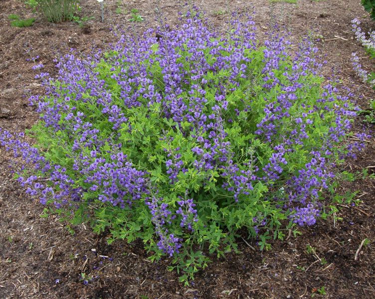 The inch-wide dusty violet-blue flowers of this selection are borne above attractive blue green foliage from mid-May into early June (USDA Zone 5). ‘Blue Mound’ develops into and maintains a perfectly uniform mound all summer, which you will think was sheared! It is equally tolerant of acidic and alkaline soils. Developed by crossing the larger, cold-hardy Baptisia australis var. australis with the compact and heat tolerant B. australis var. minor, this vigorous selection is intermediate in size to both parents, but has the heavier blooming of the larger parent and the more uniform, broad-rounded habit and finer foliage of the smaller parent. ‘Blue Mound’ offers the best of both parents!