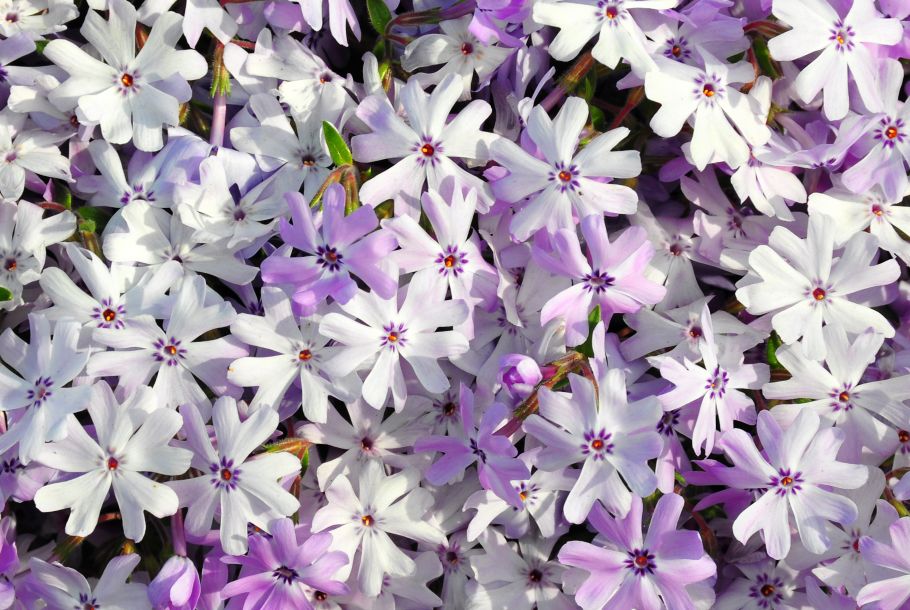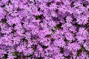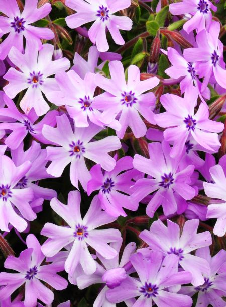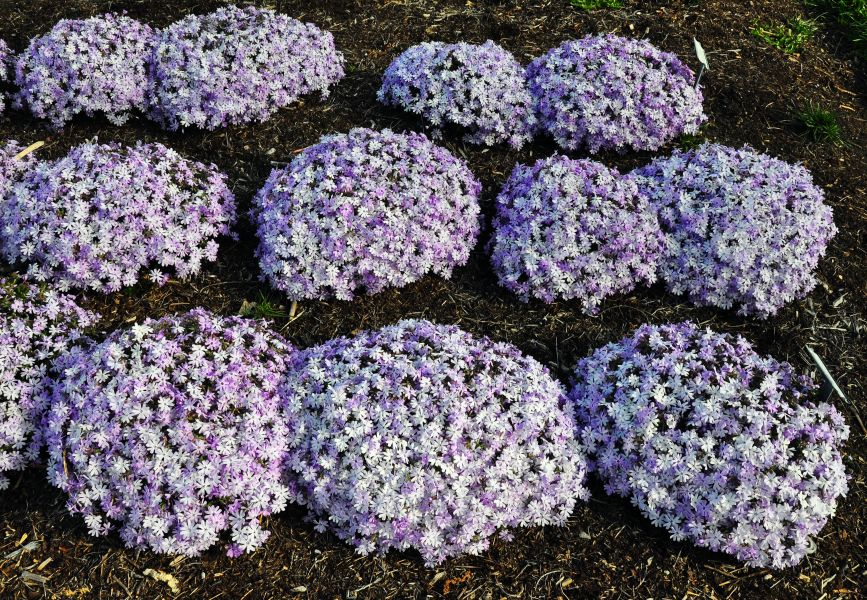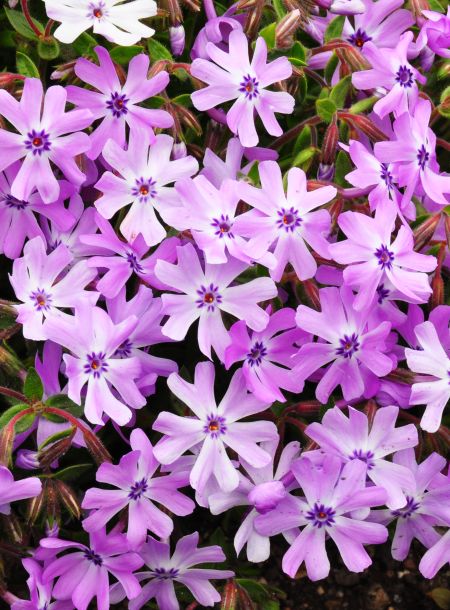 ‘Running With Scissors’ has proven to be a super-charged moss phlox in terms of flower power, vigor, and durability. The 1-inch-wide, light-to-medium violet flowers, large for a moss phlox, are produced for four to six weeks in spring. A light repeat bloom in autumn has been observed for some years. At peak bloom, the plants are 90 to 100 percent covered with flowers. Close up, you can appreciate the flowers’ cleft petals and conspicuous purple striae adjacent to the floral tube. A bonus is the faint but pleasant sweet hay fragrance. Over summer, the lush, dark green foliage reminds us of rosemary.