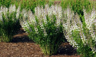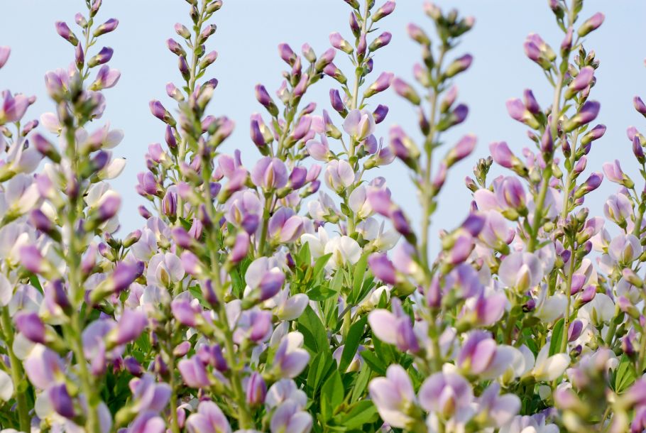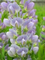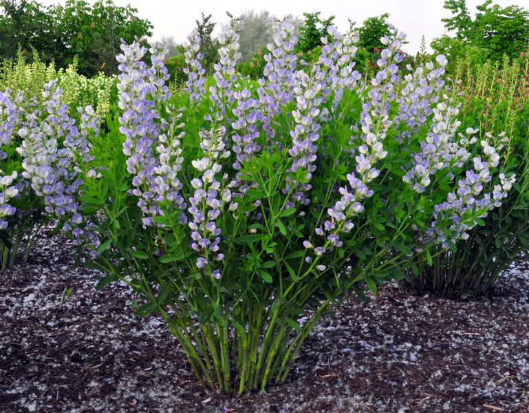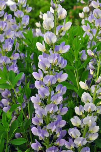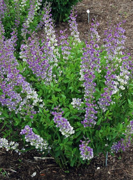 Vivid violet-lavender buds unfurl to periwinkle, lupinelike flowers with contrasting butter-cream keels. Starlite Prairieblues™ has oversized blossoms held on 24-inch-tall racemes that extend well beyond the foliage and arch grace- fully outward as they age. The flowers are positioned closely to each other, creating a very dramatic display in the garden or as a cut flower. The clean, blue-green foliage creates a fan- tastic backdrop for other flowering plants all summer long. In the late season the inflated seedpods turn charcoal-black and make valuable additions to dried flower arrangements. Starlite Prairieblues™ is a long-lived, easy-to-grow hybrid Baptisia that will produce an impressive floral display every spring. It is one of the earliest Baptisia selections to bloom at the Chicago Botanic Garden, usually showing color 7 to 10 days before B. australis and Baptisia Twilite Prairieblues™. Initially vase-shaped, Starlite Prairieblues™ becomes broad-rounded with age and has the appearance of a low, dense shrub. Its blue-green foliage remains clean and attractive all season.