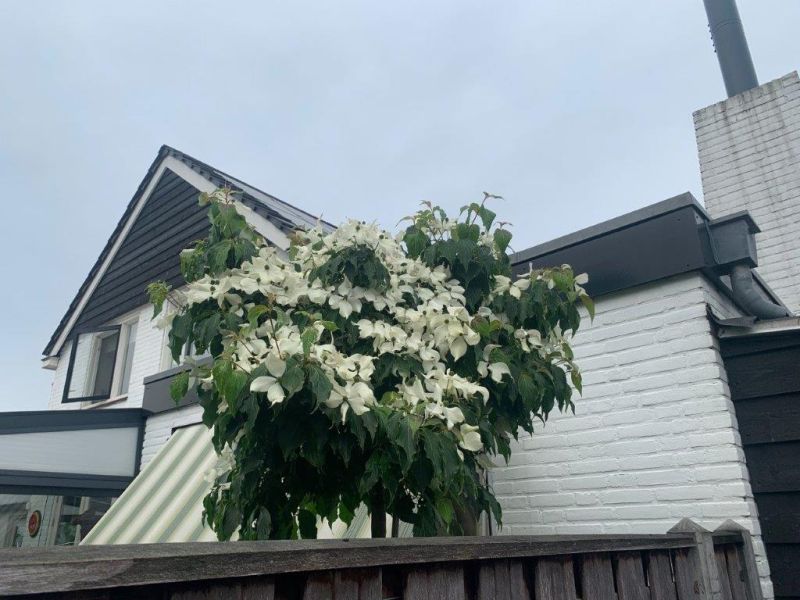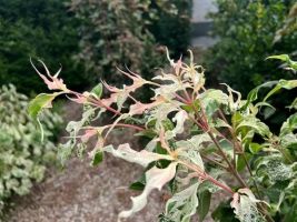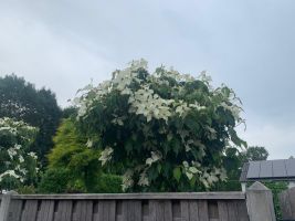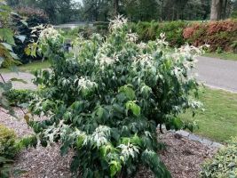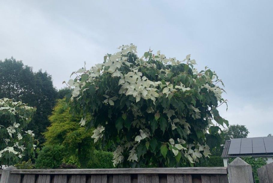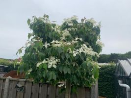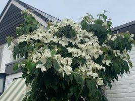 The flowers age and form typical strawberry-like fruits that stay on until a bird eats them or they fall off, giving fall and often winter interest. The bark will mottle, as all Cornus kousas do, as the tree ages and matures.