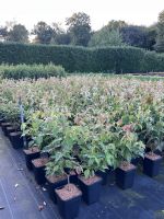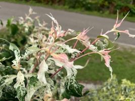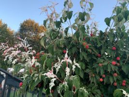 The foliage emerges green, and is followed by large, pure white star shaped flowers. As the season progresses, the foliage develops a wonderful variegation, beginning with white flecks and aging with a pink blush to the tips, giving it an overall tri-color effect similar to Salix Hakuro-Nishiki. This wonderful variegation gets stronger and stronger, as the strawberry-red fruits form in late summer and remains until true autumn, when the foliage gets darker red.