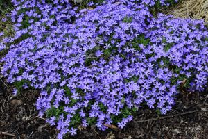 Phlox ‘Violet Pinwheels’ is a new direction in moss phlox breeding, combining the best traits of two lesser-known species, Phlox bifida and Phlox kelseyi. Blooming commences in early to mid-April in northern Illinois, well ahead of many other spring-blooming plants in the garden. The vibrant purple to violet flowers cover the low-