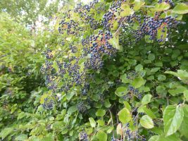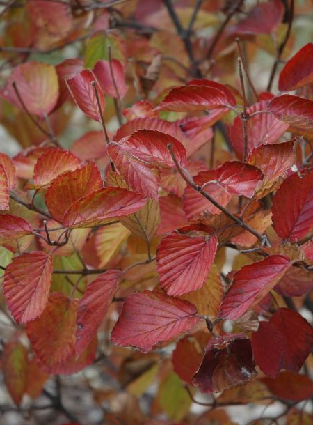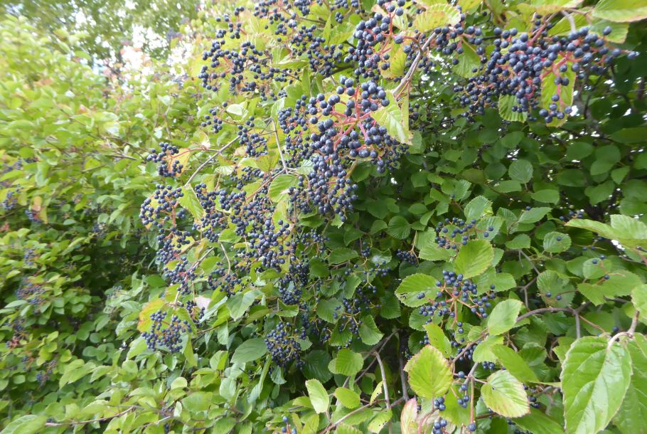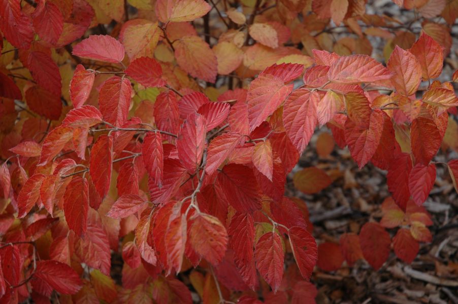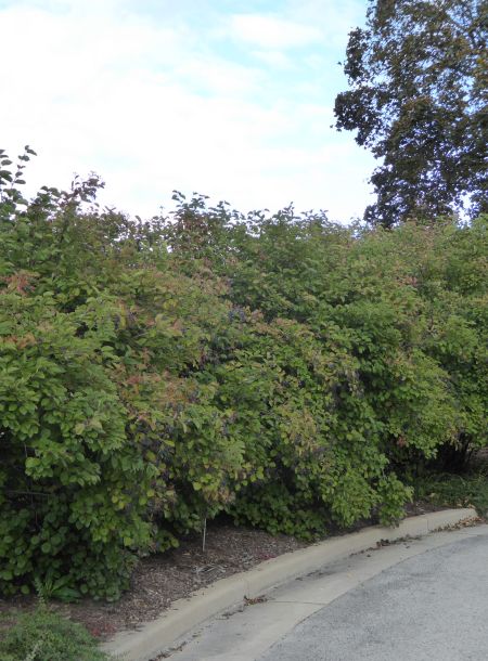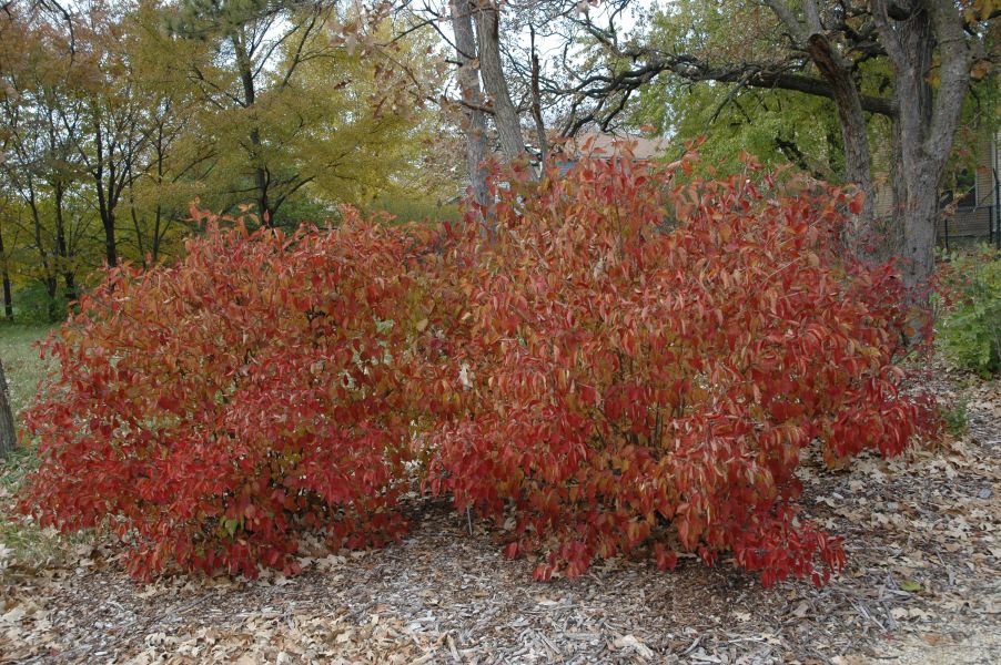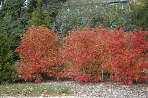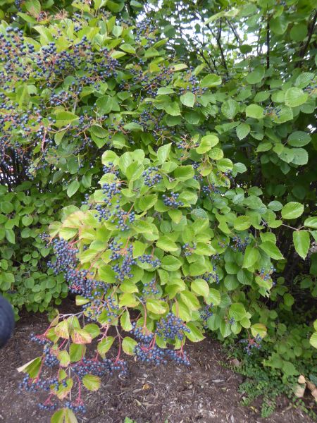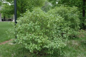 A deciduous multi-stemmed shrub attaining a mature size of 8' to 10' in height and spread. This selection has a broad, upright-rounded habit and moderately glossy, dark green foliage. Creamy white flowers appear in early to mid- June, followed by ornamental clusters of blue-black fruit in late September through October. Depending on weather conditions, fall color is a rich blend of wine-red and burgundy from late October through late November Best from softwood cuttings taken in June, 4" to 6" in l ength, treated with 1,000 ppm IBA, plus fungicide. Start cuttings under mist in torpedo sand or similar rooting media. Semi-hardwood cuttings may also be taken, with appropriate increases in IBA concentration. Rooting occurs in 4 to 6 weeks.