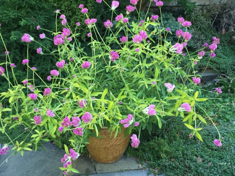 Lime green foliage contrasts nicely with the bright fuchsia ball-shaped flowers of this new globe amaranth