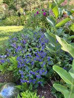 Bumblebee Blues had large clusters of hooded, salvia-like flowers with white throats. It's like a tropical salvia, but hardy to zone 4! this plant will take full sun and part shade, flowering equally in both.