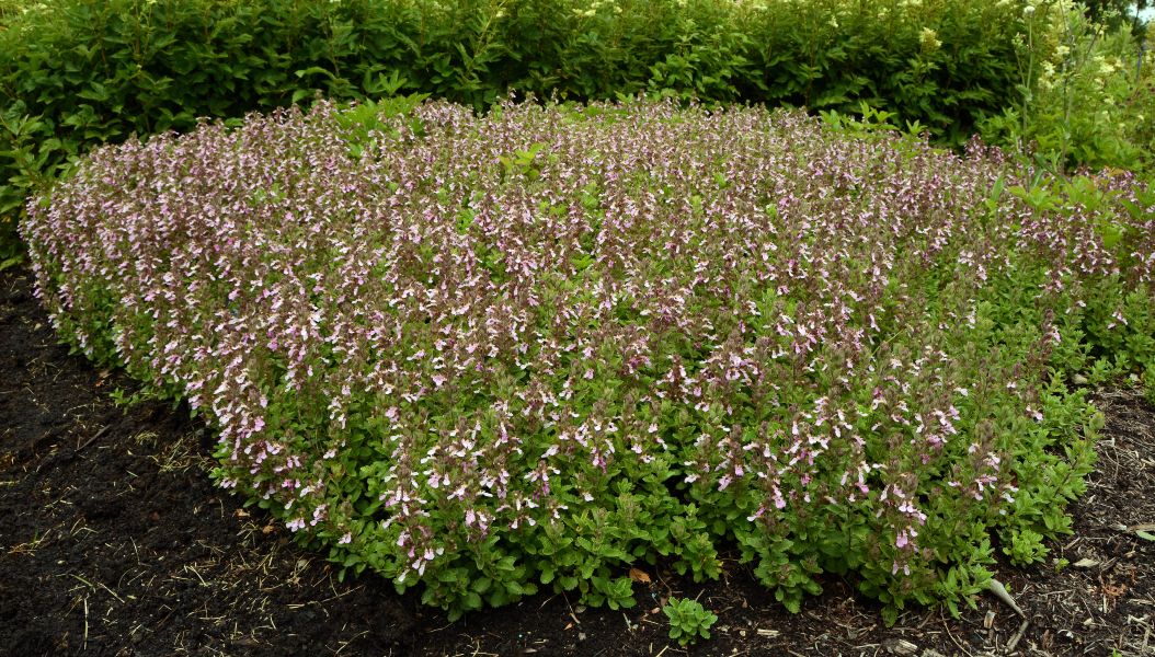 While not particularly well-known as garden plants, germanders have several desirable traits, and the Chicagoland Grows® introduction, ‘Pride of Georgia’ is no exception. Unlike other wall germanders, this selection has a low-growing, rhizomatous spreading habit that makes an excellent ground cover. With a nearly two-month bloom period beginning in midsummer, dark inflorescences with multi-toned pink flowers provide long-lasting appeal. Developed from germplasm collected in the Republic of Georgia, this cultivar will provide a unique presence to any garden. This selection can simply be grown for its attractive flowers that range from whitish-pink to deep pink borne on short, deep purple inflorescences. ‘Pride of Georgia’ has other benefits to offer though. Its short height and spreading habit make it a plant that functions well along the front edge of perennial beds. Its preference for somewhat drier conditions makes it ideal for rock gardens. Unlike other members of the mint family, its foliage lacks fragrance, but its flowers are pleasantly scented.