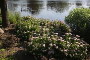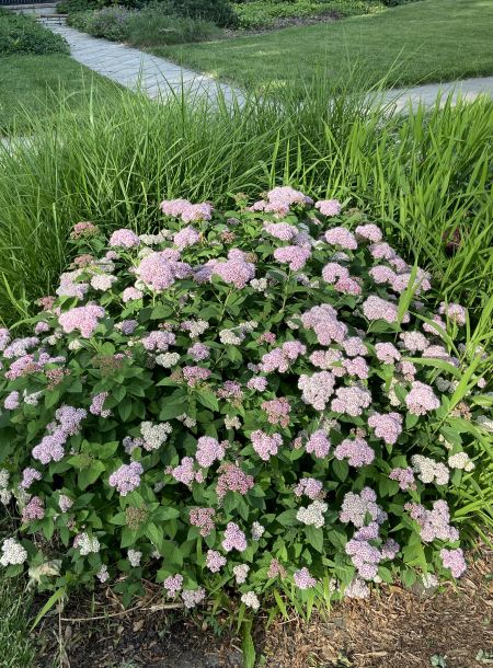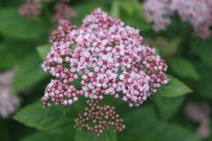 Pink-A-Licious is an attractive, compact, and uniformly mounded shrub, growing slightly wider than tall. Densely branched and fine-textured. Plants that become irregular with age can be pruned in early spring to return them to vigor and uniformity. Unlike its white flowered mother, the Pink-a-licious™ spirea has abundant, purplish-pink, flat-topped clusters of flowers in June. This cultivar has a wonderful compact and densely branched habit. It grows to 2 feet tall and 3 feet wide in southern Wisconsin. The summer foliage is clean and an attractive dark green. Fall foliage color on this plant can be outstanding, a combination of the colors of a fruit salad—pineapple yellow, watermelon pink, honeydew chartreuse, and cantaloupe orange—all on the same plant at the same time. An attractive and durable, low-growing shrub that can be grown individually or massed in a mixed border, as a filler or masking plant in front of taller shrubs, on slopes, as a foundation shrub, and in any other sites needing a shrub of its size and adaptability. Site it where its attractive early summer flowers, good dark green summer foliage, and wild mélange of fall colors can all be appreciated.